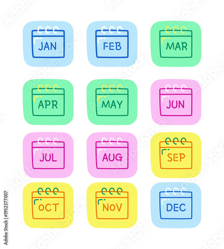 Monthly calendar hand drawn line sticker pack. Month labels. Yearly organizer. From January to December. Digital planning clip arts in doodle style. Colorful planner icons. Bullet journal elements kit