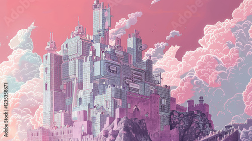 fortress, datum, chips, cloud, architecture, digital, fantasy, pink, blue, technology, castle, structure, landscape, futuristic, design, art, illustration, creative, imaginative, scenery, building, cyber, surreal, environment, defense