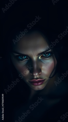 Moody style, fine art photograph of a beautiful woman with intense expression, low angle, soft shadows, realistic lighting, cinematic details, emphasizing gaze and strong features. Graceful, elegant.