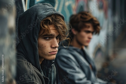 Moody Teenagers with Hoodies Sitting by Graffiti Wall in Urban Setting