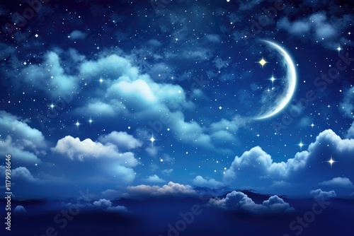 Moon and Stars over a Marvellously Beautiful Blue Night Sky with Clouds