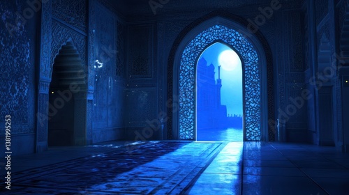 moonlit, night, palace, blue, moon, night scene, ornate, granite, marble, taj mahal, doorway, archway, stained-glass, moonlight, serene, peaceful, tranquil, mystery, magic, fantasy, dreamlike, royals, opulent, regal, luxury, illuminated, shadow, carpet, rug, tile, building, structure, interior, design, architecture, digital artwork