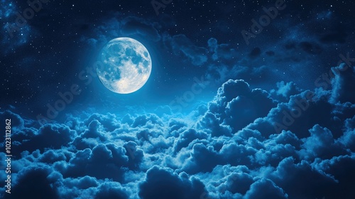 Moonlight shining on clouds, mystical night scene with a full moon.