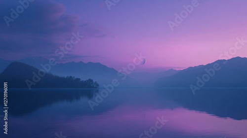 Moonlit lake, misty mountains, twilight serenity, peaceful landscape, travel poster
