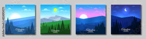 Morning, noon, evening and night. Set of abstract vector landscape card. Flat style design. Beautiful sky. Mountains with hills and forest. Touristic poster design.