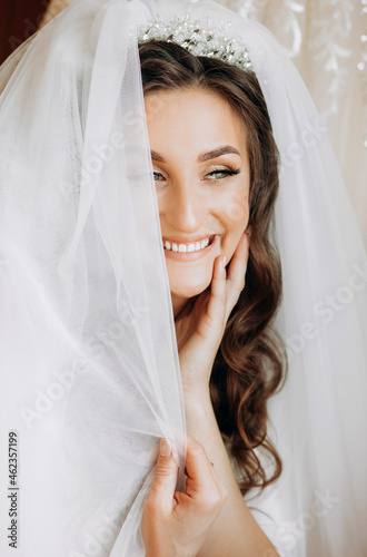 Morning of the bride. portrait of a beautiful young woman with long hair in a veil.