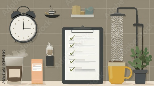 Morning Routine Checklist With Coffee Cup, Clock, and Shower in a Modern Bathroom Setting