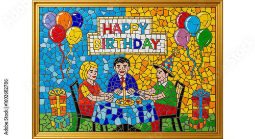 Mosaic art depicting a birthday celebration with three people at a table, balloons, gifts, and a "Happy Birthday" message.