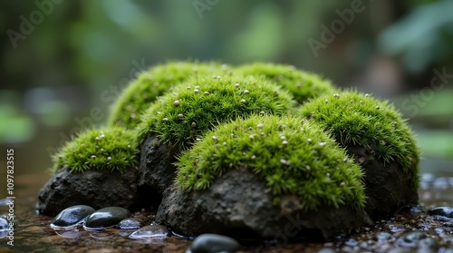 leaf, moss, nature, forest, rainforest, rock, grass, green, outdoors, tree trunk, day, plant, stone, tree, calmness, growth, horizontal, image, land, landscaping, machine, meadow, middle, no people, photo, round, stream, color image, foliage, hill, japanese garden, photo, vegetation, timberland, alpha, collection, empty, granite, ivy, set, shape, wild, boulder, circle, covered, czech republic, generative, ai