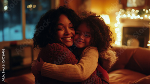 mother, daughter, hug, christmas, love, family, home, cosy, warm, winter, holiday, festive, light, decoration, childhood, parenting, togetherness, happiness, joy, affection, bonding, human relationships, portrait, indoor, evening, night, smiling, cheerful, happy, african american, ethnicity, tradition, celebration, christmas eve, interior, fireplace, sofa, comfort, domestic life, lifestyle, eltern, children, girl, woman
