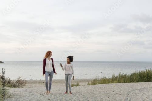 mother, daughter, woman, girl, mature, adult, 2, pair, caucasian, mixed race, walk, beach, sand, sea, casual attire, togetherness, vacation, outdoors, day, cloudy, happy, people, lifestyle