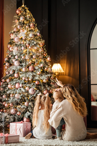 mother and daughters near the New Year tree with their backs to the camera. christmas.family holiday