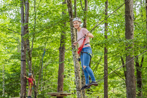 Mother and son climbing in extreme road trolley zipline in forest on carabiner safety link on tree to tree top rope adventure park. Family weekend children kids activities concept