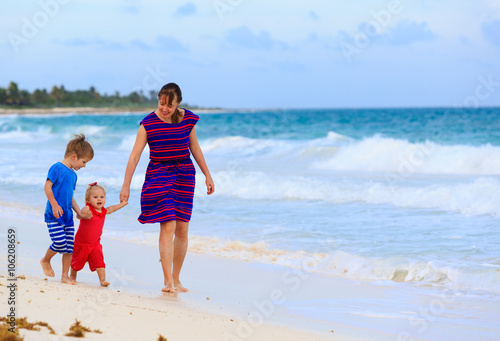 mother and two kids walking on the beach