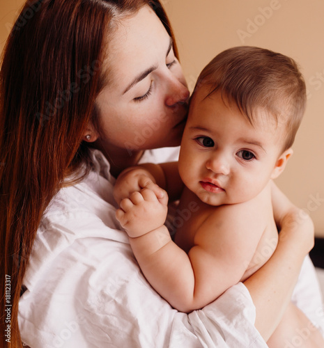 Mother holds tender naked child in her arms