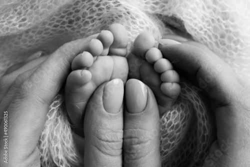 Mother is doing massage on her baby foot. Closeup baby feet in mother hands. Prevention of flat feet, development, muscle tone, dysplasia. Family, love, care, health concepts. Black and white macro.