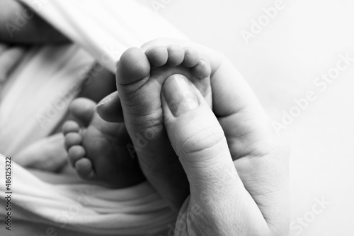 Mother is doing massage on her baby foot. Closeup baby feet in mother hands. Prevention of flat feet, development, muscle tone, dysplasia. Family, love, care, health concepts. Black and white macro.
