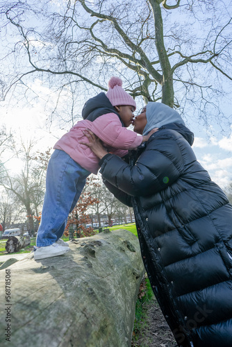 young adult, missy, children, girl, african ethnicity, mother, daughter, kissing, park, log, togetherness, affectionate, standing, lifestyle, leisure, headscarf, britain, london, vertical, outdoors, day, two people