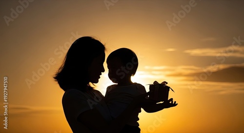 Mother's day silhouette of loving mother and child at sunset