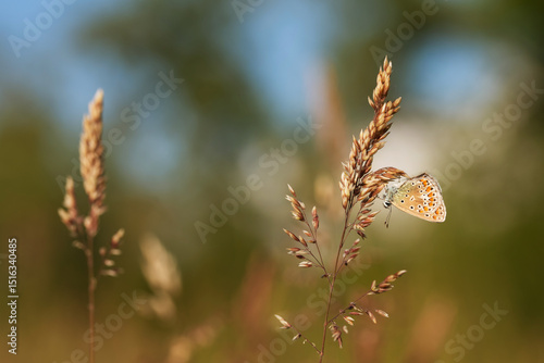 Motyl na łące na kwiatach, sezon letni, tło.