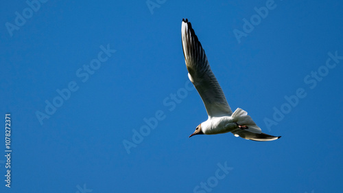 Mouette rieuse en plein vol dans un ciel bleu