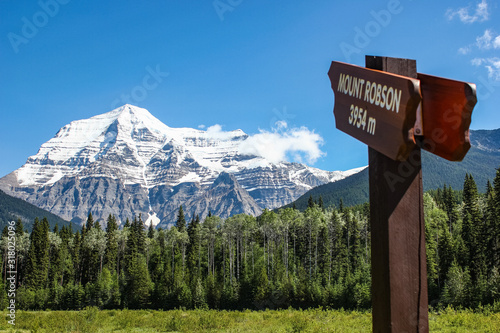 Mount Robson with a wooden sign to the top in early spring season daytime, Mount Robson Provincial Park, British Columbia, Canada