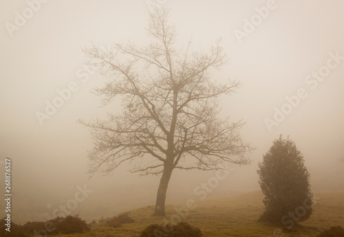 Mount Urkiola, Basque Country with Anboto mountain. Church, forest and walkers in the fog. Spain