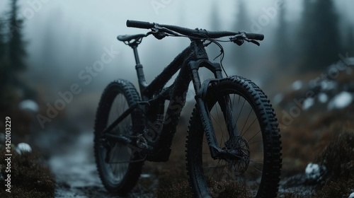 Mountain bike in a misty forest trail