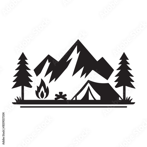 mountain, camp, vector, silhouette, clip art, logotype, design, illustration, abstract, hill, icon, collection, camping, camper, campfire, forest, van, graphic, sticker, hiking, badge, outdoors, vintage, climbing, hiker, element, landscape, poster, signs, tour tourism, nature, black, background, summer, travel, isolated, art, retro, home, fire, adventure, print, wilderness, black-and-white, idea