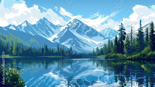 illustration, mountain, lake, serene, towering, pine, tree, rugged, peak, water, reflecting, clear, blue, sky, cloud, nature, scenic, beauty, tranquil, landscape, outdoors, wilderness, majestic, peaceful, calm, alpine, idylli, fresh, picturesque, evergreen, rocky, horizon, crisp, stillness, countryside, panorama, wild, pristine, surrounding, quiet, retreat, environmentally friendly, pastoral, adventurous, natural, breathtaking