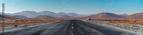 Mountain landscape and asphalt highway under a clear blue sky
