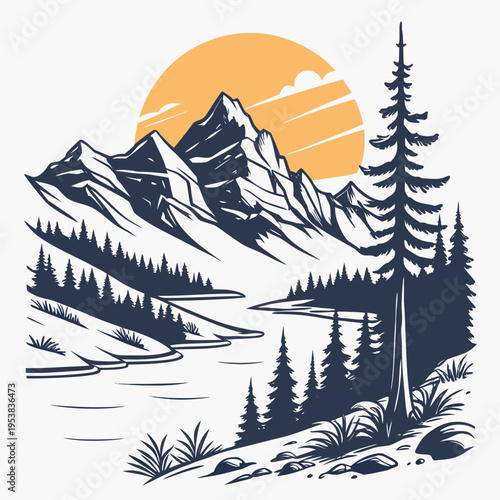 mountain, landscape, pine tree, lake, sunset, white cloud, nature, scenery, outdoors, tree, water, pine, stylised, large, orange, circle, behind, mountain, white, cloud, foreground, style, colours, pattern