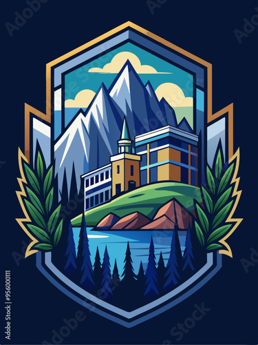mountain, filed, emblem, pine, tree, tree, lake, water, sky, cloud, blue, green, yellow, brown, nature, landscape, building, architecture, window, roof, design, graphic, illustration, art, style, forest, scenic, summer, beautiful, peaceful, tranquil, serenity, calmness