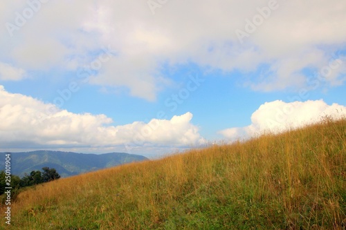 sky, landscape, nature, grass, cloud, blue, cloud, mountain, meadow, green, autumn, hill, view, beautiful, horizon, mountain, scenery, outdoors, weather