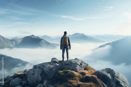 mountain, nature, man, travel, person, adventure, backpack, minimal, scenery, sport, cloud, blue, sky, landscape, photo, clothing, outdoors, hiking, summit, people, adult, shoe, holiday, downloadable, standing, mountain chain, human, photo, head, land, rock, bag, fog, enjoying, glove, avocation, sunlight, vacation, walking, image, jean, mountaineering, backpacking, exploration