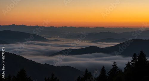 Mountain Panorama at Sunrise: A breathtaking landscape showcases a serene vista of layered mountain ranges enveloped by a sea of mist, under a vibrant, orange-hued dawn sky.