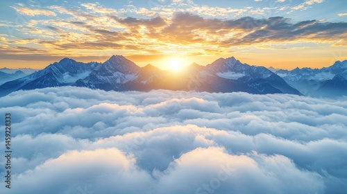 landscape, mountain, cloud, sunrise, sky, nature, view, peak, altitude, high, sunlight, morning, aethereal, majestic, beauty, panorama, horizon, vista, heavenly, idylli, dreamlike, peaceful, tranquil, serene, blue, white, orange, yellow, gold, up high, huge, expanse, scenery, background, travel, tour tourism, adventure, climb, hike, exploration, outdoors, environment, freedom, escape, relaxation, calm, inspiring, breathtaking