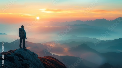 Mountain range at sunrise close up, focus on the first light, copy space, ensure vibrant colors, Double exposure silhouette with a hiker