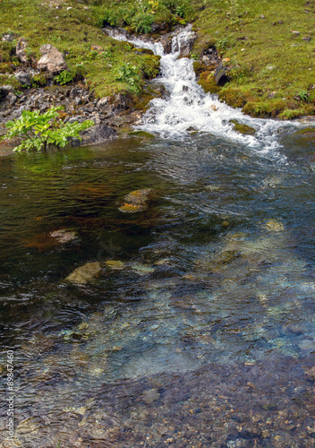 Mountain steam and watercourse Fast moving river with small waterfall falling into lake clean transparent water well visible colorful stones on bottom of watercourse