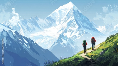 Mountain trekking vector illustrations, showing hikers on trails with stunning mountain backdrops like the Himalayas