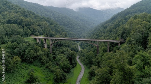 Mountain Valley Bridge, Dense Forest, Aerial View. Possible Stock Photo Use Showing Nature's Majesty