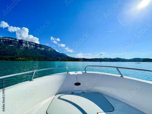 Mountain view with blue lake seen from the edge of a boat