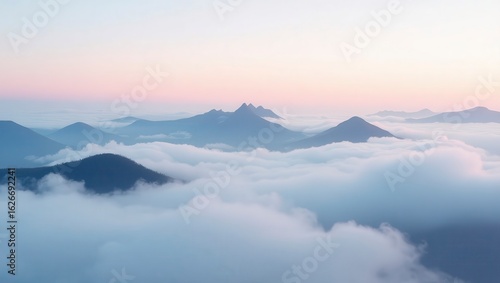 mountain, cloud, landscape, sunset, sky, nature, mist, fog, evening, scenery, peak, mountain, dawn, horizon, silhouette, blue, pink, peaceful, serene, dreamy, tranquil, beauty, up high, aerial, view, vibrant, panorama, high, elevation, atmosphere, weather, calm, light, pastel, colours, sun, glow, haze, vale, outdoors, travel, wilderness, natural, scene, dramatic, range, top, cloudscape