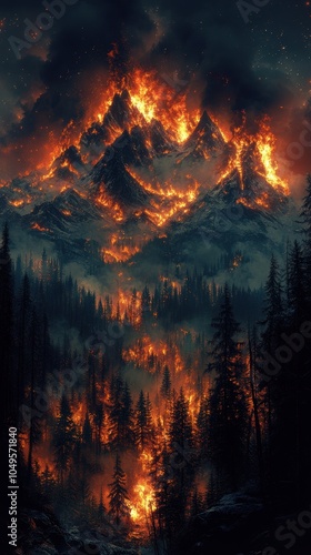 Mountainside Inferno, a fierce forest fire engulfs the landscape, flames rise dramatically above treetops, smoke billows into the sky