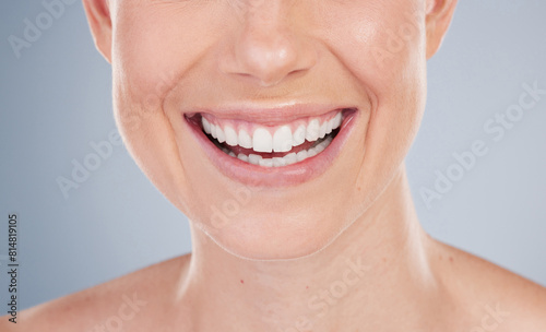 Mouth, teeth and smile of girl closeup in studio for dental care, oral hygiene and healthy gums. Female model, wellness and veneers for confidence, pride and whitening of tooth by white background