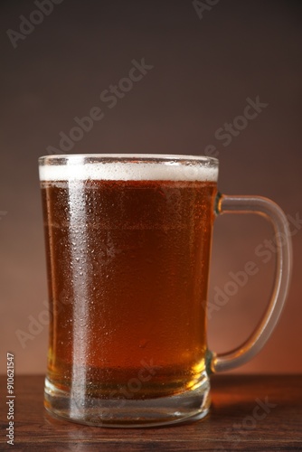 Mug with fresh beer on wooden table against brown background, closeup