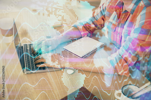 Multi exposure of forex graph with man working on computer on background. Concept of market analysis.