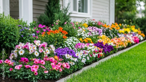 Multicolor blooming front garden. Outdoor summer gardening. Multi-colored flower bed in the park. Lots of beautiful summer flowers. Lush bright flowering in the garden.