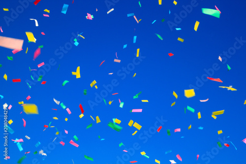 multicolored confetti on clear blue sky background. Concept of holiday backdrop