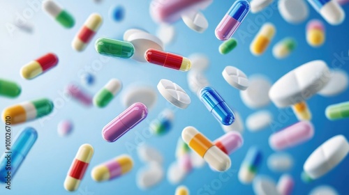 Multi-colored pills and capsules of drugs flying in all directions
